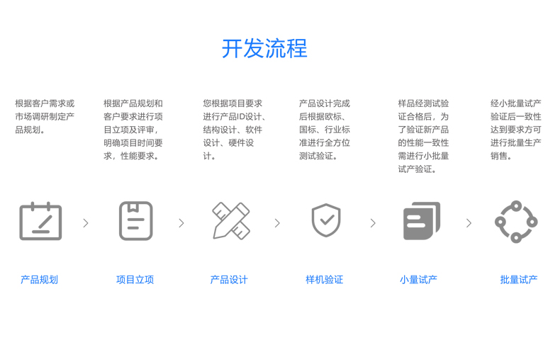 嚴謹完善的開發流程:項目需求-項目評審—項目立項-項目開發-ID評審-結構評審原理圖評審-PCB評審-樣機評審-樣機驗證-小批量試產-大批量生產;