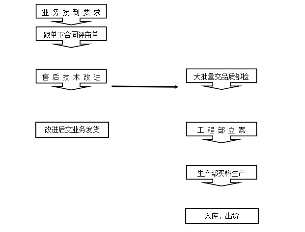 1)當(dang)業(ye)(ye)務(wu)部接到特殊訂(ding)單(dan)(dan)時,跟單(dan)(dan)根(gen)據業(ye)(ye)務(wu)員提供客(ke)戶的要求下《合同評審單(dan)(dan)》。交與售(shou)后(hou),售(shou)后(hou)根(gen)據單(dan)(dan)據要求領(ling)料改進。小批量(liang)樣品改進檢測合格后(hou),(10套以(yi)下)交業(ye)(ye)務(wu)部發給客(ke)戶。