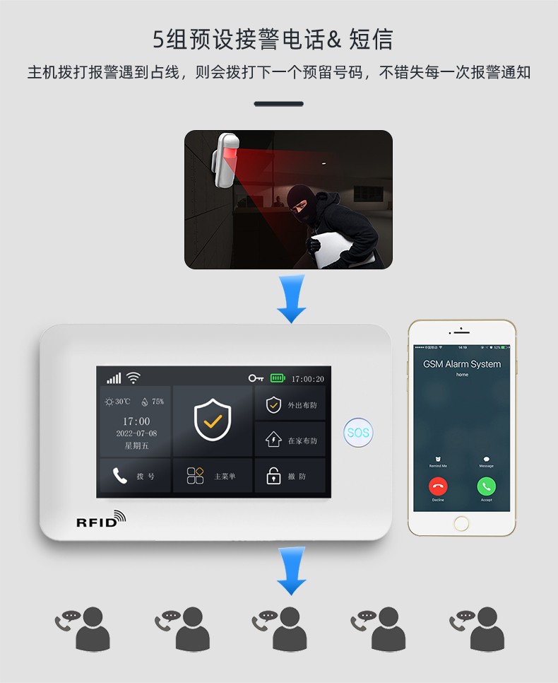 預設(she)5組電話和短(duan)信號碼,可(ke)分別(bie)設(she)置其短(duan)信開/關和語音開/關