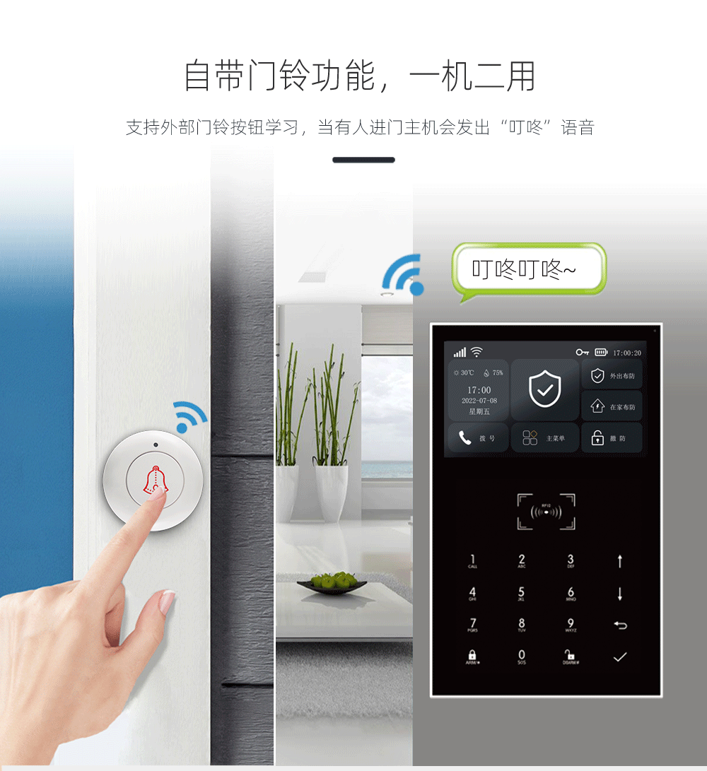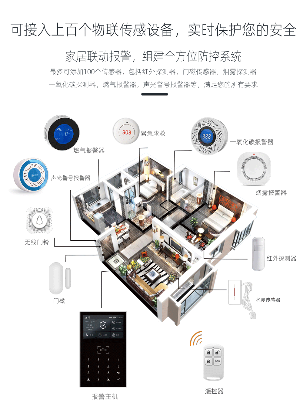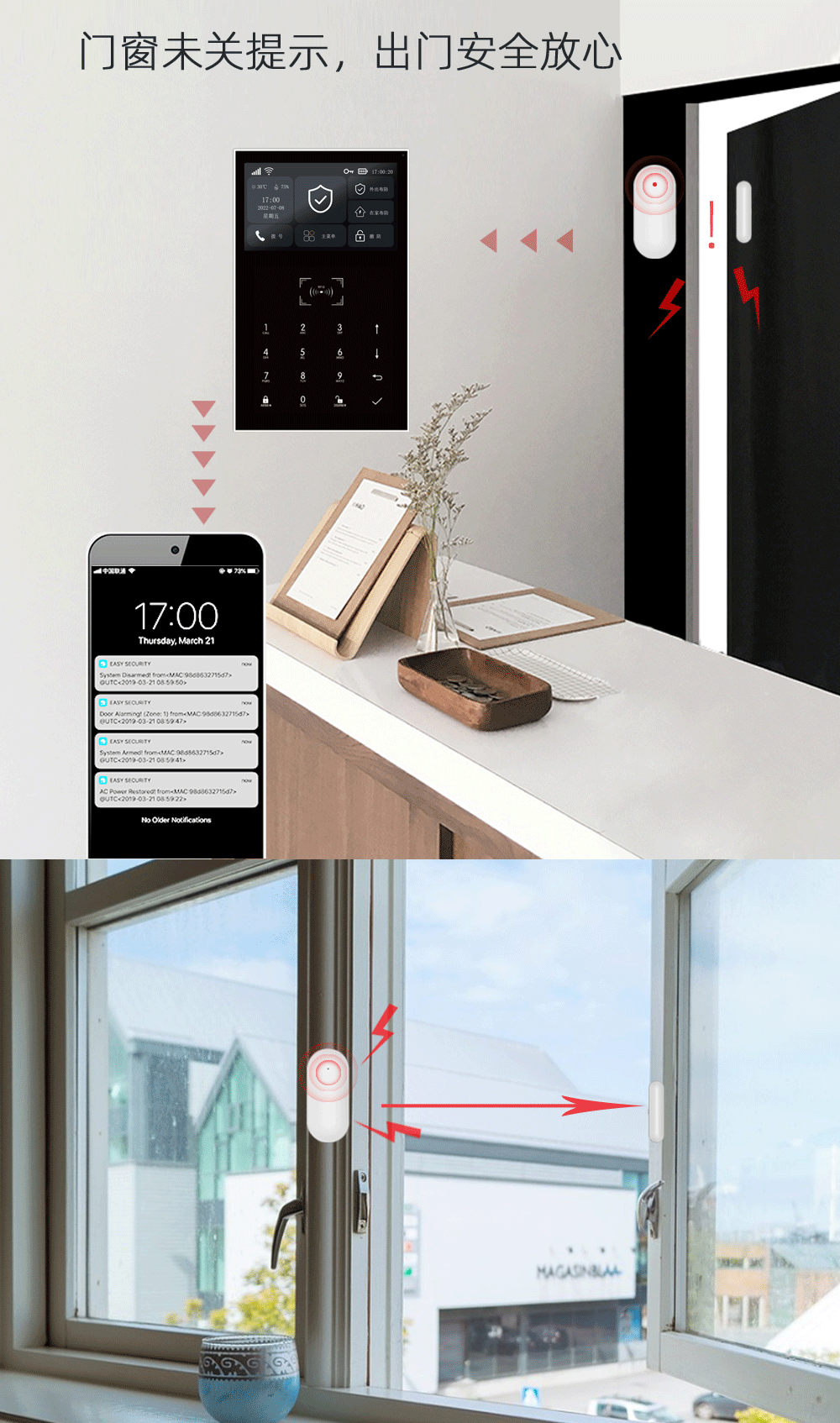 無線傳(chuan)感器低(di)電壓報警提(ti)醒;布防(fang)時(shi)門窗未關提(ti)示(shi);