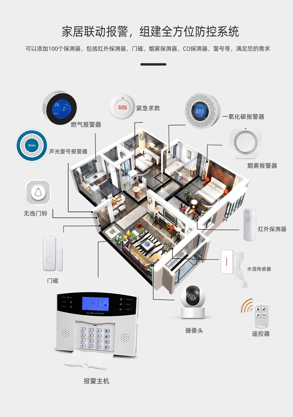 報警編程:求(qiu)救、火災、煤氣、大(da)廳、窗戶、陽臺(tai)、周界;