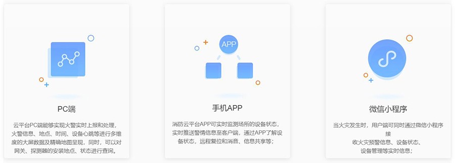 ![]() | 系統架構 城中村火災防控系統基于NB-IoT無線網絡,運用物聯網、移動互聯網、大數據、云計算技術,實時監控區域內消防設備/設施運行狀態,當發生火災警情,可通過云平臺實時彈窗、自動語音電話、手機APP/小程序信息推送通知消防單位、及管理人員/用戶等,具有發現警情早、告警流程簡單、早處理等功能,有效解決校園場所消防監督管理難點。 |