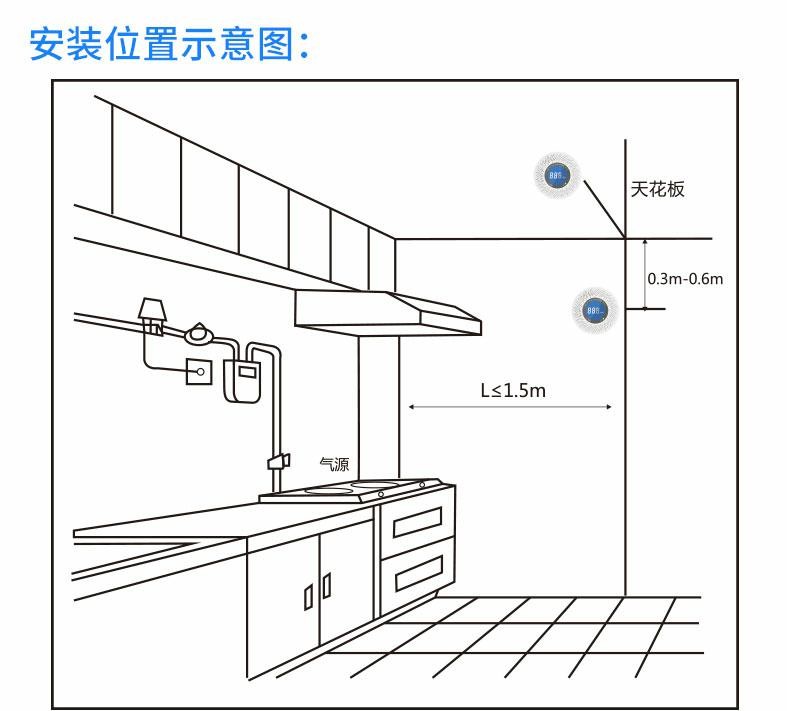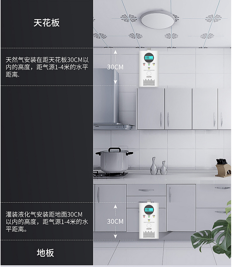 1.家(jia)用燃氣報警器:可安裝在距離氣源半徑1-4米的(de)水平范圍內,通風良好處:液(ye)化(hua)氣(qi)比空氣(qi)重(zhong),安裝在(zai)距地(di)面約0.3米(mi)處。天然氣、城市煤氣等(deng)比空氣輕,安裝(zhuang)在距天花(hua)板約0.3米(mi)處(chu)。不能(neng)安裝(zhuang)的位置(zhi)有:墻角、柜(ju)內等空氣不易(yi)流(liu)通的位置(zhi);易(yi)被油煙(yan)等直接熏著的位置(zhi)。