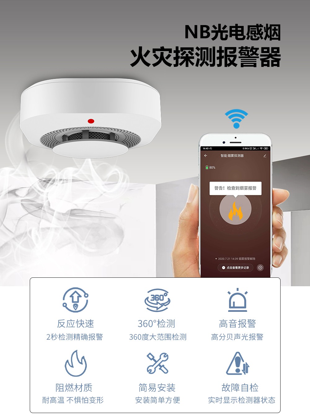 4.報(bao)警(jing)方式 NB煙(yan)感:立(li)體復合(he)報(bao)警(jing),PC平臺、電話、短信、APP、本地聲光。 傳統煙(yan)感:報(bao)警(jing)單一(yi),不能遠程報(bao)警(jing)