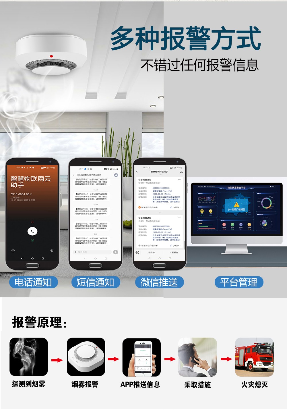 火災(zai)警情實時監控,多種途徑報(bao)警推送(song),快(kuai)捷高(gao)效