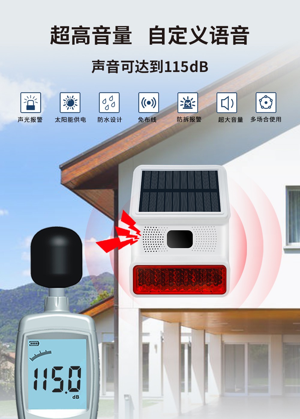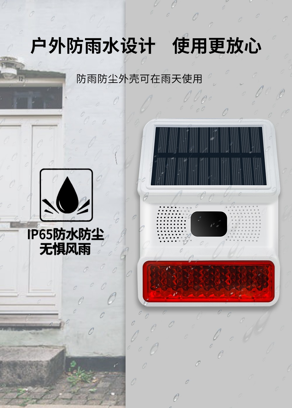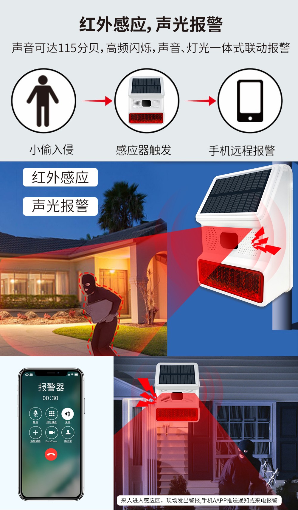 無線太陽(yang)能紅外聲光報(bao)警器分為聯(lian)網型和RF型,探(tan)測距離(li)8-12米,角度(du)110度,這(zhe)是一款可以自(zi)定義報(bao)警(jing)語音,高性能的(de)帶太陽能充電的(de)戶(hu)外數(shu)字(zi)被動紅(hong)外現場(chang)聲光報警器。能夠(gou)有效防(fang)水、防(fang)塵、防(fang)蟲、防(fang)風和(he)其(qi)他戶外(wai)干擾因素。該產品應用如(ru)下先進技術:超低功耗芯片技術(shu),WiFi聯網技術,NB/4G無(wu)線(xian)通訊技(ji)術(shu),太(tai)陽能持續充電和供電,音頻和高亮(liang)度閃(shan)燈同時報警提醒。使用穩定、性能先(xian)進、IP-65防水的整(zheng)體結構設計(ji),可以應(ying)用于商鋪(pu)、別墅、養殖場、森林防火、高壓電桿、公園、倉庫(ku)、碼頭等一切需要現場語(yu)音和強光(guang)警(jing)示的地方。