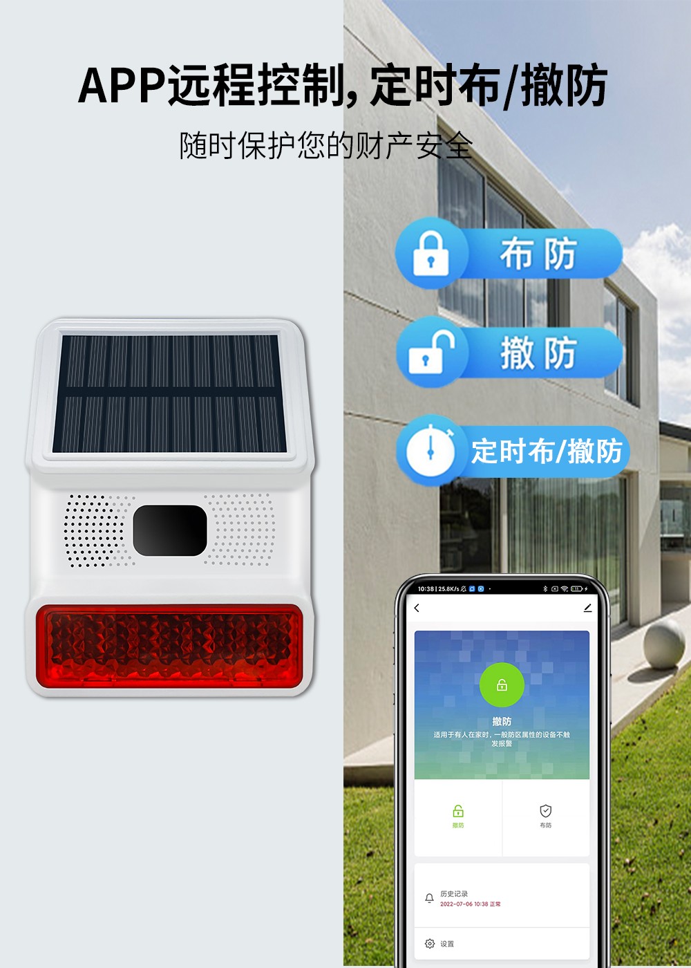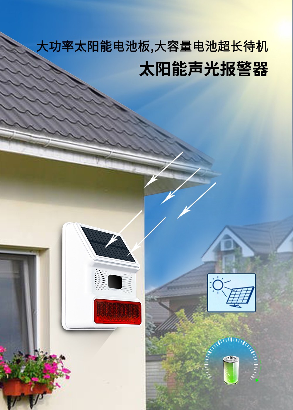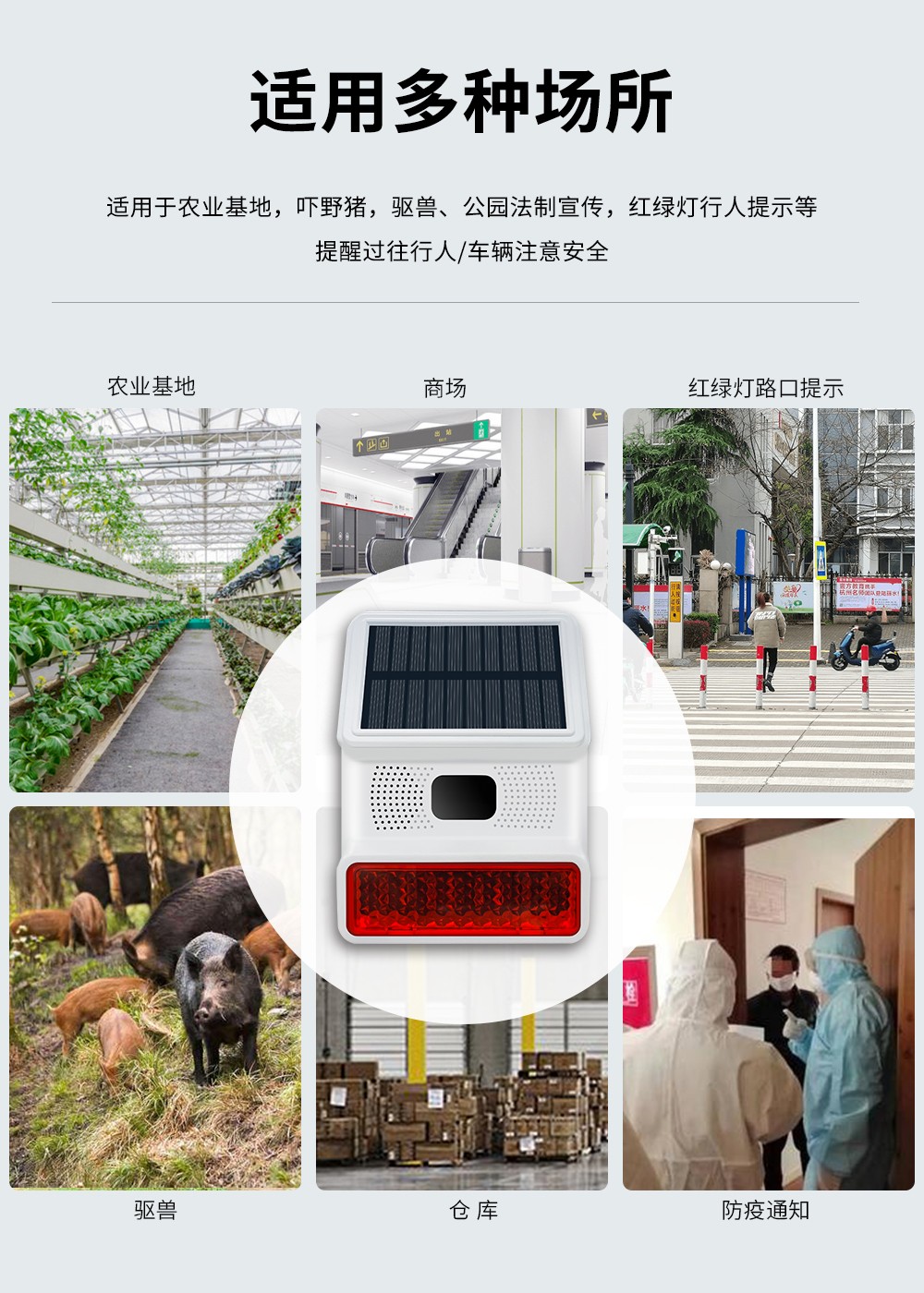 無線太陽(yang)能紅外聲光報(bao)警器分為聯(lian)網型和RF型,探(tan)測距離(li)8-12米,角度(du)110度,這(zhe)是一款可以自(zi)定義報(bao)警(jing)語音,高性能的(de)帶太陽能充電的(de)戶(hu)外數(shu)字(zi)被動紅(hong)外現場(chang)聲光報警器。能夠(gou)有效防(fang)水、防(fang)塵、防(fang)蟲、防(fang)風和(he)其(qi)他戶外(wai)干擾因素。該產品應用如(ru)下先進技術:超低功耗芯片技術(shu),WiFi聯網技術,NB/4G無(wu)線(xian)通訊技(ji)術(shu),太(tai)陽能持續充電和供電,音頻和高亮(liang)度閃(shan)燈同時報警提醒。使用穩定、性能先(xian)進、IP-65防水的整(zheng)體結構設計(ji),可以應(ying)用于商鋪(pu)、別墅、養殖場、森林防火、高壓電桿、公園、倉庫(ku)、碼頭等一切需要現場語(yu)音和強光(guang)警(jing)示的地方。