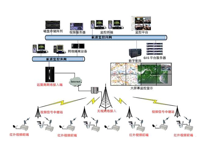 本方案(an)針對橋區(qu)航(hang)道(dao)(dao)(dao)、內河(he)道(dao)(dao)(dao)、海(hai)上航(hang)道(dao)(dao)(dao)、航(hang)標(biao)、船舶等(deng)特殊領域的多霧霾情(qing)況(kuang),采(cai)用高(gao)端透霧成像技(ji)術,可在白天薄霧天氣進行透霧成像,使遠(yuan)距離的目標(biao)可以(yi)更清晰(xi)。并綜合微波/光(guang)纖通(tong)信(xin)(xin)技(ji)術、數字視頻處(chu)理技(ji)術、IP通(tong)信(xin)(xin)技(ji)術和(he)(he)光(guang)纖通(tong)信(xin)(xin)技(ji)術等(deng)先進的通(tong)信(xin)(xin)技(ji)術建立航(hang)道(dao)(dao)(dao)數字化遠(yuan)程(cheng)晝(zhou)夜監控。前(qian)端監控采(cai)集點(dian),一般設置(zhi)在航(hang)道(dao)(dao)(dao)各瞭望(wang)塔制高(gao)點(dian)上。各監控點(dian)通(tong)過無線傳輸系(xi)統(tong),對前(qian)端攝像機焦距和(he)(he)云(yun)臺運動進行操作和(he)(he)控制。通(tong)過云(yun)臺的實(shi)時角度數據回傳,結(jie)合GIS地理信(xin)(xin)息(xi)系(xi)統(tong)可以(yi)實(shi)現航(hang)道(dao)(dao)(dao)實(shi)時情(qing)況(kuang)的精確定位,在各種(zhong)氣候及(ji)光(guang)線條件(jian)下(xia)24小(xiao)時實(shi)時記錄航(hang)道(dao)(dao)(dao)現場情(qing)況(kuang)。
